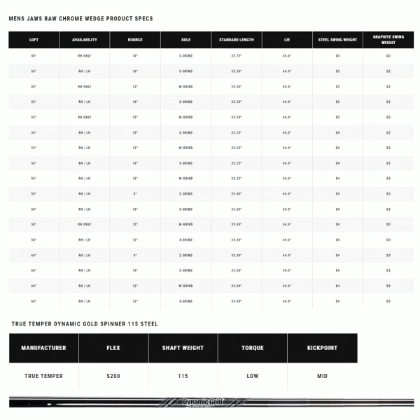 The Callaway 22 Jaws Raw brings raw scoring performance to your wedge game. Featuring the most aggressive grooves in golf, with a raw face that promotes maximum spin. For the first time ever, Callaway is bringing tungsten technology to a wedge, for a weight balanced club that offers both feel and control. These new technologies are balanced with the craftsmanship honed from Roger Cleveland’s 40+ years of designing some of the most sought-after wedges in golf. The plating has been removed on the face, which exposes the groove edge for maximum friction and spin. This also allows for rusting over time in the scoring, without impacting playability. The premium look is maintained across the rest of the clubhead. The Jaws Raw lineup includes 17 loft and bounce combinations per finish to fit a wide variety of wedge needs starting with our brand new, tri-level sole Z Grind, standard S, wide sole W, and high bounce X grind.